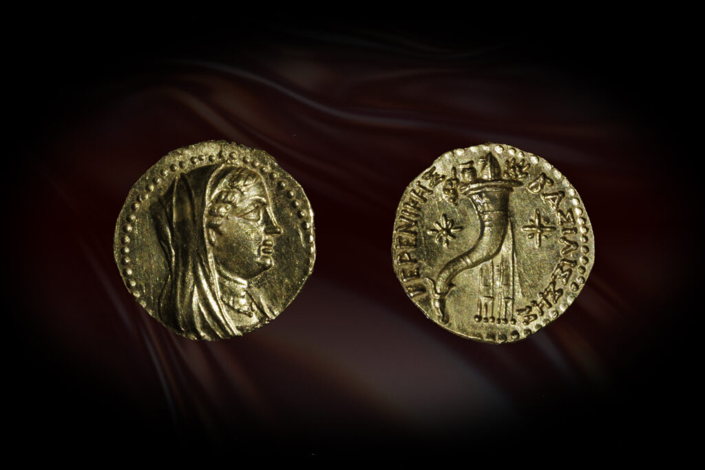 The obverse of the coin depicts Berenice as a Hellenistic queen, wearing a diadem and veil, with a necklace around her neck. The reverse shows a cornucopia, an ancient symbol of prosperity and fertility, flanked by two stars. A surrounding Greek inscription reads “ of Queen Berenice.”