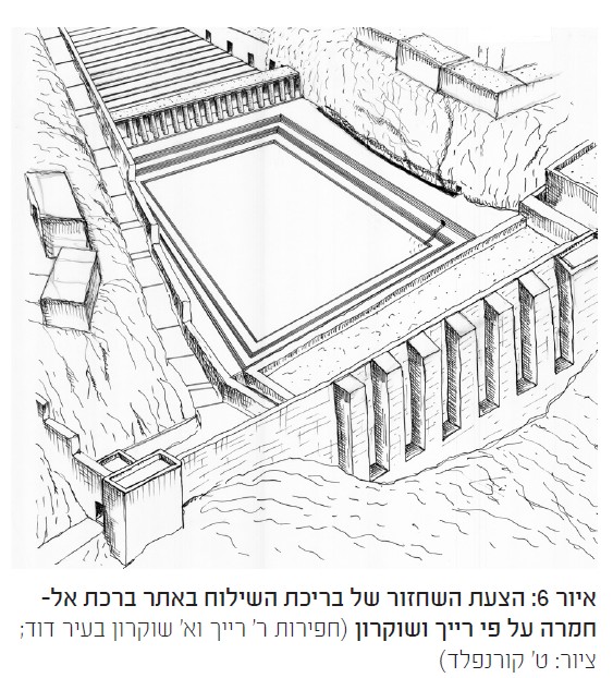 הם חשפו במקום גרם מדרגות מונומנטלי בן שני שלבי בנייה, היורד כלפי מרכז אתר ברכת אל-חמרה שברובה נותרה מחוץ לגבולות החפירה שלהם, וכן קיר בציר צפון–דרום (קיר הסכר) שקדם לגרם המדרגות. את השלב הראשון של גרם המדרגות תיארכו לאמצע המאה הראשונה לפסה"נ, על סמך מטבעות של המלך 'ינאי' שהיו חתומים בתוך תשתית המדרגות הללו (שם: 93). את השלב השני, הבנוי גזית, תיארכו לשלהי ימי הבית השני (שם). הקיר בציר צפון–דרום תוארך על ידם לשלהי תקופת הברזל על סמך קדמותו לגרם המדרגות ועל סמך שבר אינדיקטיבי מתקופה זו שנמצא בתוך הטיח שחיפה את הפן המערבי של הקיר. קיר זה זוהה על ידם עם קיר הסכר של הבריכה, וגרם המדרגות משלהי ימי הבית השני שוחזר על ידם למלוא רוחבה ואורכה של ברכת אל-חמרה (איור 6). בריכה זו זוהתה על ידם עם בריכת השילוח ההיסטורית (שוקרון ורייך 2005: 40–37), אם כי לדעתנו יש לזהות את ברכת אל-חמרה עם "בריכת שלמה" ואת ברכת סילואן שבמוצא נקבת השילוח עם "בריכת השילוח" (להרחבה ראו: זנטון 2023).
