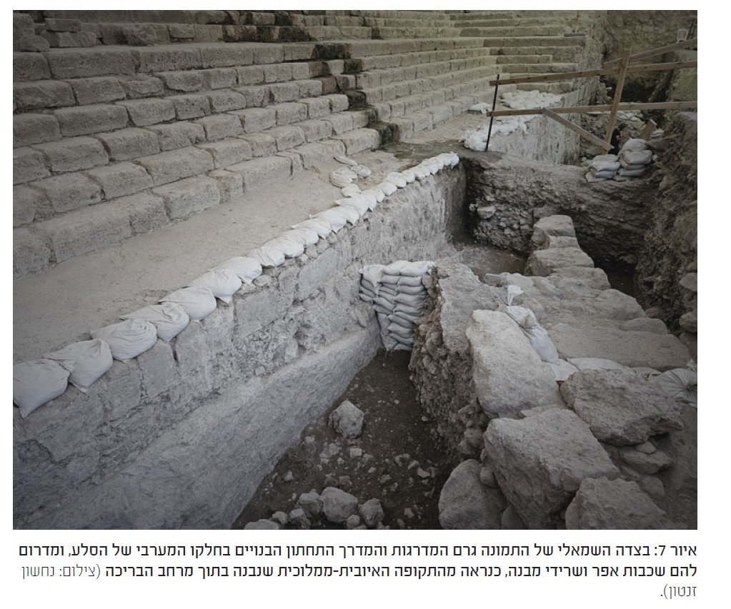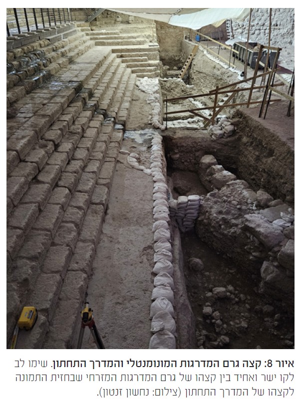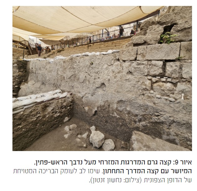 המונומנטלי שמעליו. האגף המזרחי של גרם המדרגות ממשיך לדרום עד קצהו, המתיישר ביחס לקו המדרך התחתון החדש (איורים 8–9). הבנייה כאן מסודרת וישרה, ללא סימנים לשדידת אבנים או שבירתם. בכדי לקבל פנים חלקות ואחידות כוסה הפן האנכי כולו בטיח אפור־בהיר שהשתמר באתרו בצורה חלקית.