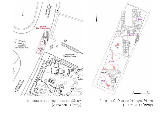 בחפירה שהתקיימה בכניסה למרכז המבקרים בעיר דוד (איור 29) ובסמוך למתחם המכונה ״בור ירמיהו״, מדרום לחומת העיר העתיקה וממזרח לחפירות חניון גבעתי, נחשפו שרידיו של מבנה מפואר (אורכו בגבולות החפירה כ־10 מ׳ ורוחבו בגבולות החפירה כ־3 מ׳) (איור 30), המתוארך לתקופה הרומית המאוחרת—המאה ה־4 לסה״נ. בחלק מחדרי המבנה נחשפו רצפות פסיפס; חלקן עוטרו בדגם גיוש ובעיטורים גאומטריים. תיארוכו של המבנה לתקופה הרומית המאוחרת מתבסס בעיקרו על ממצא כלי החרס ומספר מטבעות אשר נחשפו בחפירה (עוזיאל 2013; דן־גור וצ׳חנובץ 2020; עוזיאל—בפרסום). נראה שמבנה זה מזכיר במידה מסוימת את שרידי המבנים מן התקופה שנחשפו בחפירות חניון גבעתי ותוארו לעיל.